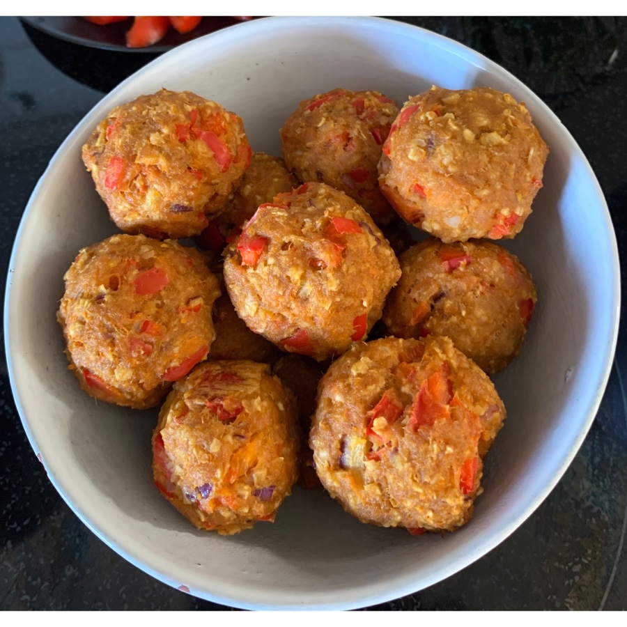 En burk tonfisk i vatten, en finriven morot, en halv hackad röd paprika, en bit hackad rödlök, ett ägg, ca 1,5 dl havregryn, lite olika kryddor som paprikapulver, lökpulver, cayennepeppar, salt och peppar. Det går att variera lite som man vill. Varför inte färska kryddor eller vitlök?