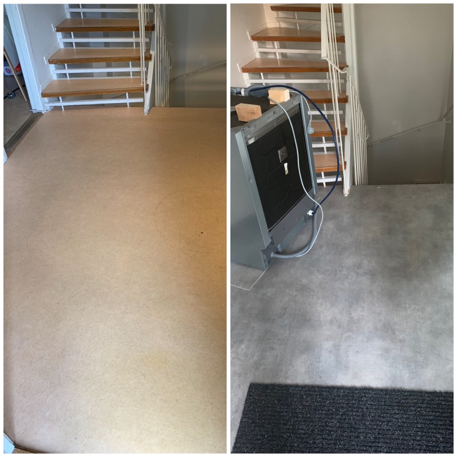 Vi flyttade in här den 1:a september förra året och nu har vi äntligen fått nytt golv i både hallen och köket. Bilden nedan visar före och efter i hallen.