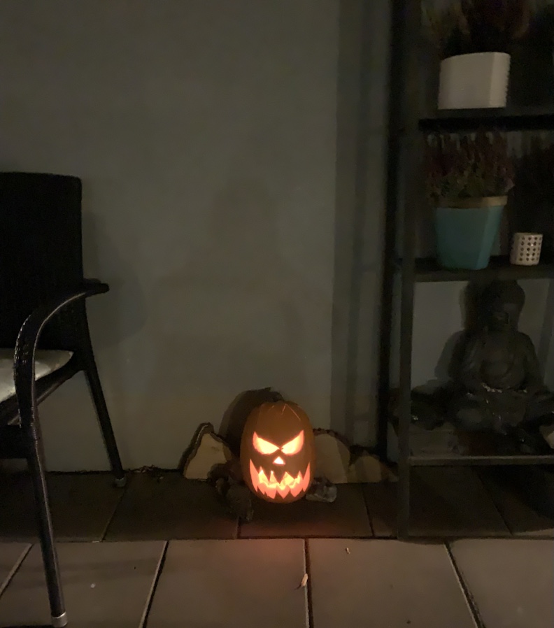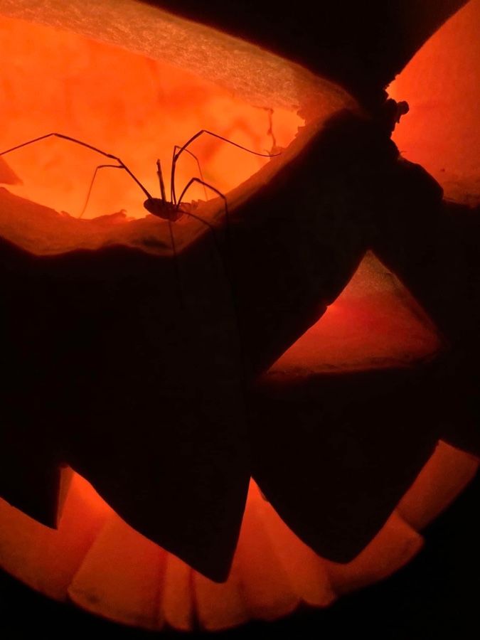 Sen såg vi att en spindel flyttat in i pumpan 😱 Då blev den ännu mer creepy 😅