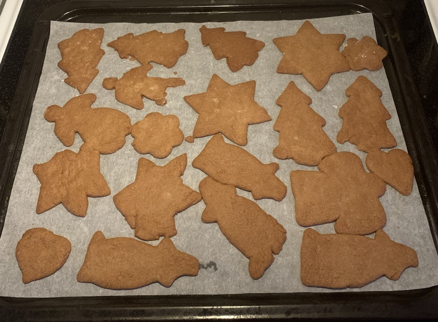 Glutenfria degar är besvärligare än vanliga så vi fick kämpa på rätt bra och använda en hel del potatismjöl innan vi lyckades få ihop en hel plåt kakor. Den gick inte att kavla ut lika tunt heller för då fastnade degen i bordet och på kaveln så det blev tjocka pepparkakor i år – men ändå var det svårt att få loss dom från bordet! Det blev inga vackra skapelser direkt 😄