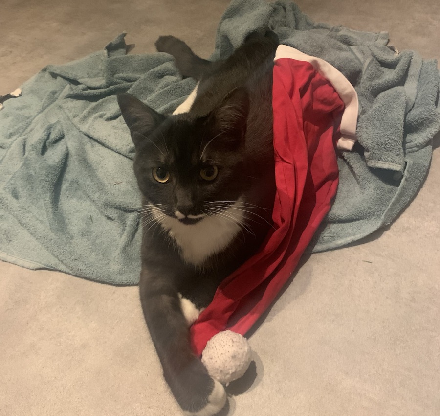 Den lille kissen stal en tomteluva från torkställningen på övervåningen och busade ner den i hallen. 😂❤️