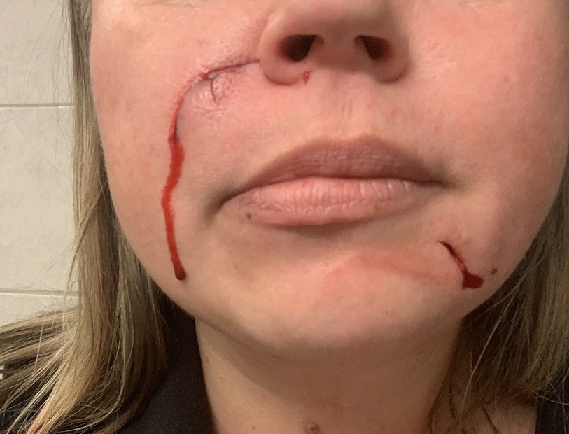 (Bilden nedan är tagen efter attacken. Det ena ärret syns tydligt från näsborren och nedåt).