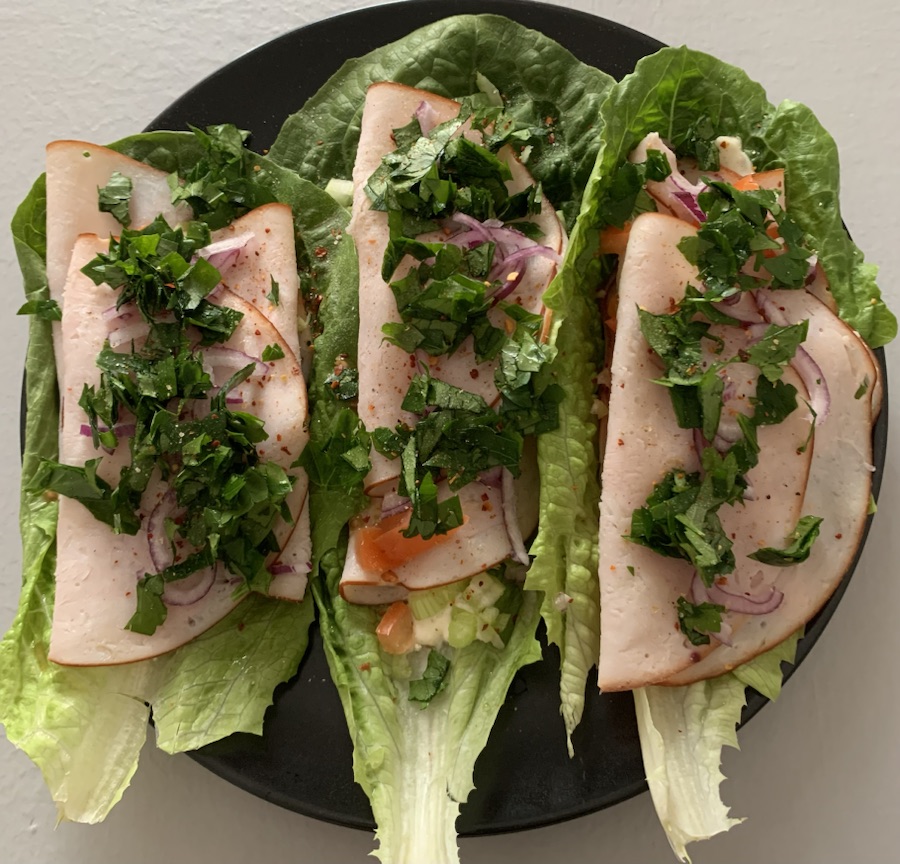 Igår åt jag bland annat salladswraps med rökt kalkon, en klick majonnäs, tomat, selleri och rödlök toppat med persilja. Såå gott!!