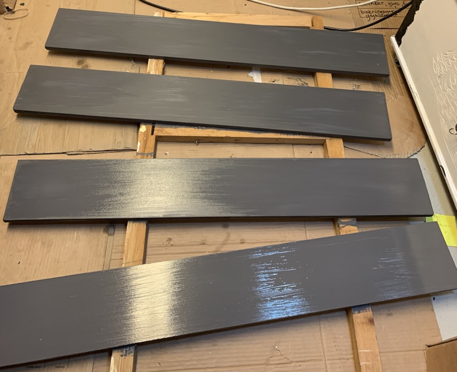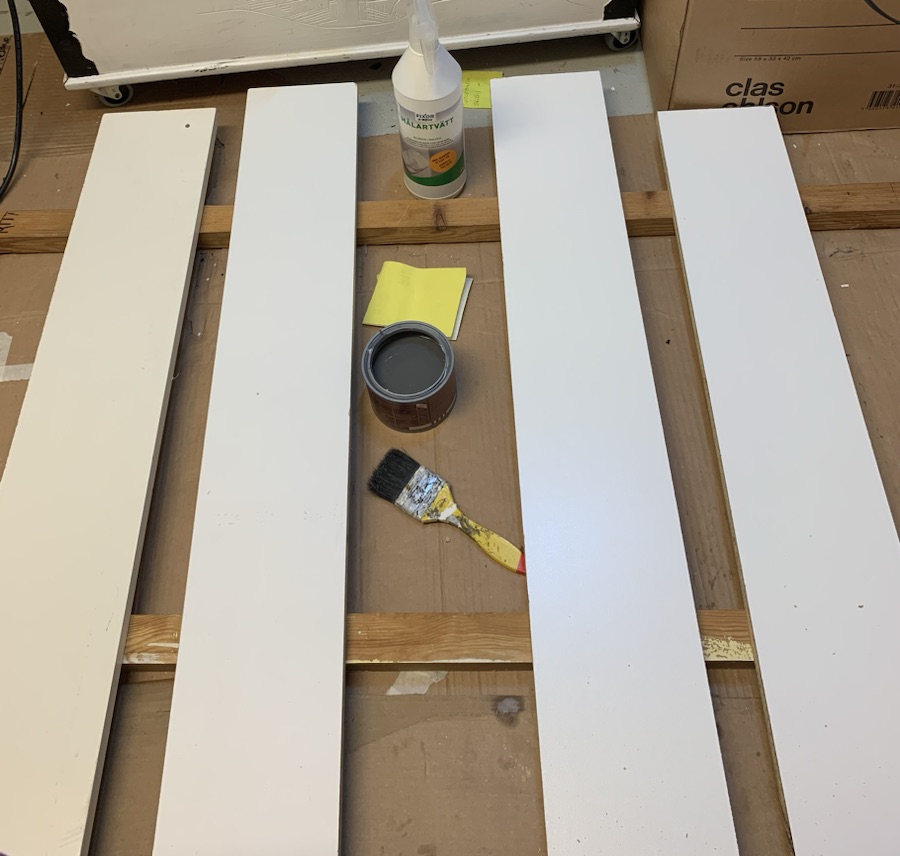 Jag fick en vision om hur bra det skulle bli med hyllplan i köket. Min man hittade en ”brädbit” vid återvinningen och sågade ut fyra hyllplan av den.