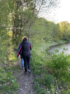 Det blev en 30-minuters powerwalk över stock och sten. Lite orolig var jag för att min fot inte skulle hålla men det gick bra! Sen avslutade vi med korvgrillning i skogen. Jättetrevligt!