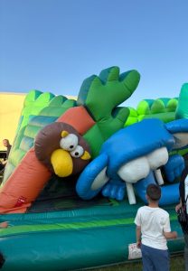 Utanför fanns en hoppborg (till Cazpians stora förtjusning) där han hoppade i säkert 45 minuter! Men…helt plötsligt gick luften ur borgen som rasade ner över alla barn! Panik! Jag och en annan förälder som stod närmast kastade oss fram och försökte lyfta upp ingången så barnen kunde åla sig ut. Som tur var gick det bra och ingen kom till skada!