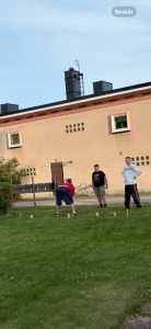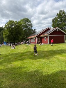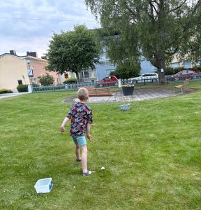 Senare på eftermiddagen gick vi över till grannen och hade knytkalas med traditionell midsommarmat. Vi spelade kubb, kastade boll på burkar och avslutade med pilkastning och lite musik. Tur med vädret hade vi oxå.