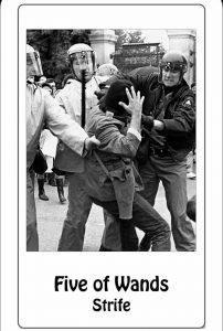 Kortet symboliserar att det kan finnas någon form av konflikt i ens liv. Det kan handla om en redan pågående konflikt eller något som ligger och pyr och så småningom kan explodera. Eller så kan det handla om kommunikationsproblem, till exempel en situation där ingen egentligen vill lyssna på den andre. Då uppstår varken förståelse eller överenskommelser. Kortet kan spegla en grupp människor som inte har tålamodet att höra vad de andra har att säga. Alla vill bara få fram sin egen röst, och eftersom att ingen lyssnar så slutar det med att alla pratar i mun på varandra. Det här kan ofta lösas genom att någon tar första steget och öppnar för en mer ordnad kommunikation, till exempel genom att föreslå att alla får tala till punkt – en i taget. På så vis kan problemet hanteras och alla får chansen att bli hörda = alla blir nöjda.
