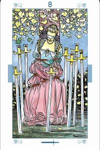 Åtta i svärd är ett kort som ganska ofta dyker upp, och det beror på att det finns väldigt många som upplever sig ”sitta fast” i sin situation på olika sätt. Kanske det är så att du grubblar för mycket, oroar dig eller känner att du sitter fast i en situation där du själv inte ser någon lösning. Det kortet vill säga är att det faktiskt finns vägar ut men att du inte har förmågan att se dom just nu. Det beror förmodligen på att din rädsla eller osäkerhet skymmer sikten. Det här kan liknas vid att du står framför en olåst dörr men tror att den är låst. Därför tar du inte ens i handtaget för och kolla om den är låst eller inte. I det här fallet så är det dina tankar som skapar din känsla av fångenskap. Kortet säger att du har makten att förändra dina tankar och på så sätt kunna släppa taget om dom.