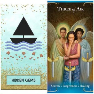 Korten visar på att du just nu går igenom (eller nyligen har gått igenom) något som känts tungt, jobbigt eller känslomässigt utmanande. Det ena kortet handlar ofta om sorg, besvikelse eller en situation där hjärtat behövt tid för att läka. Det andra kortet säger att mitt i det som känns svårt finns något värdefullt som du ännu inte har sett.
