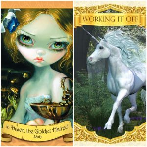 Kort 1 handlar om ansvar, plikt och att göra det som behöver göras även fast det känns tungt eller orättvist. Det kan vara ett åtagande, ett löfte eller helt enkelt livets krav just nu. Kort 2 säger att det inte finns något snabbt avslut eller någon magisk genväg utan vad det än är så löser man det genom handling, uthållighet och att fortsätta framåt, även när det känns monotont. Det här är något som man behöver ”jobba av” tills det blir klart.