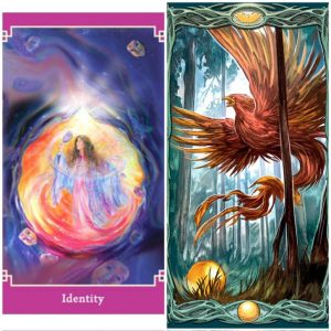 Kort 1 handlar om vem du är innerst inne, din kärna, din känsla av att ”det här är jag” – bortom roller och förväntningar. Det kan oxå visa på att du håller på att hitta tillbaka till dig själv, eller att du just nu funderar extra mycket på vad som är sant för dig. Kort 2 symboliserar en jordnära kvinna. Hon är trygg, omtänksam, praktisk och har koll på vardagen – ekonomi, hem, kropp och rutiner. Hon tar hand om både sig själv och andra, men utan drama.