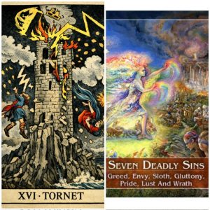 När dessa kort kommer upp tillsammans handlar det om en vändpunkt där något som inte riktigt varit i balans får ge vika. Det behöver inte ses som en plötslig katastrof utan snarare som ett uppvaknande – ett ögonblick där det blir tydligt att vissa sanningar inte längre går att blunda för. Tornet visar på en förändring som kan kännas omvälvande men som oxå skapar klarhet. I kombination med De Sju Dödssynderna visar korten att det som sker ofta är en följd av att något har dragits för långt, eller att man tappat kontakten med sin inre balans. Det handlar mindre om att något ”bara råkar hända”, och mer om att gamla mönster nu är redo att släppa taget och förändras.