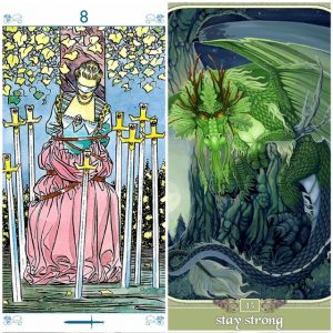 Åtta i Svärd är ett kort som har dykt upp rätt ofta på senare tid, och det står normalt för känslan av att sitta fast, att vara begränsad, maktlös – som att yttre omständigheter styr allt. Men nu har energierna börjat skifta om där. Begränsningarna finns fortfarande, men nu börjar du inse att de inte är så absoluta som de verkar. Nu finns en uppvaknande energi. Du ser att mycket av det som hållit dig tillbaka har varit rädslor, självtvivel eller gamla tankemönster. Det kan kännas som en blandning av lättnad och obehag. Friheten finns där, men den kräver att du tar ansvar och faktiskt gör något annorlunda. Det är inte längre lika ”bekvämt” att skylla på omständigheter, utan nu blir frågan vad du själv tänker göra. Ibland kan kortet oxå visa att du håller på att släppa taget om negativa tankar, bryta en inre loop eller våga se sanningen i en situation du tidigare undvikit. Det kan handla om att sätta gränser, lämna något som begränsar dig, eller bara börja tro på din egen handlingskraft igen.